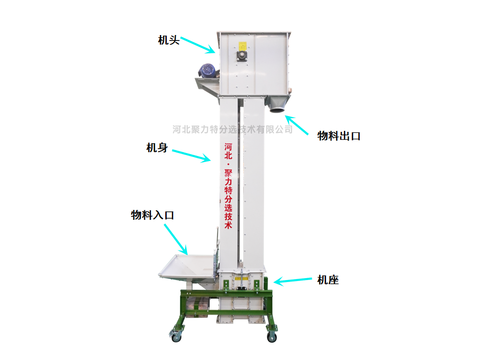 3、机筒采用双筒结构,上、回料分开,且设计有挡粮板结构,避免了下落粮食进入从动轮造成挤压破碎;